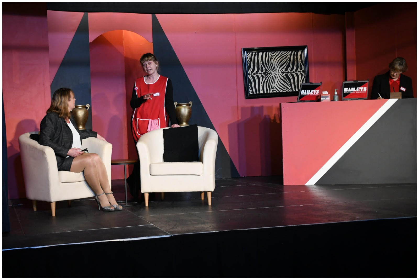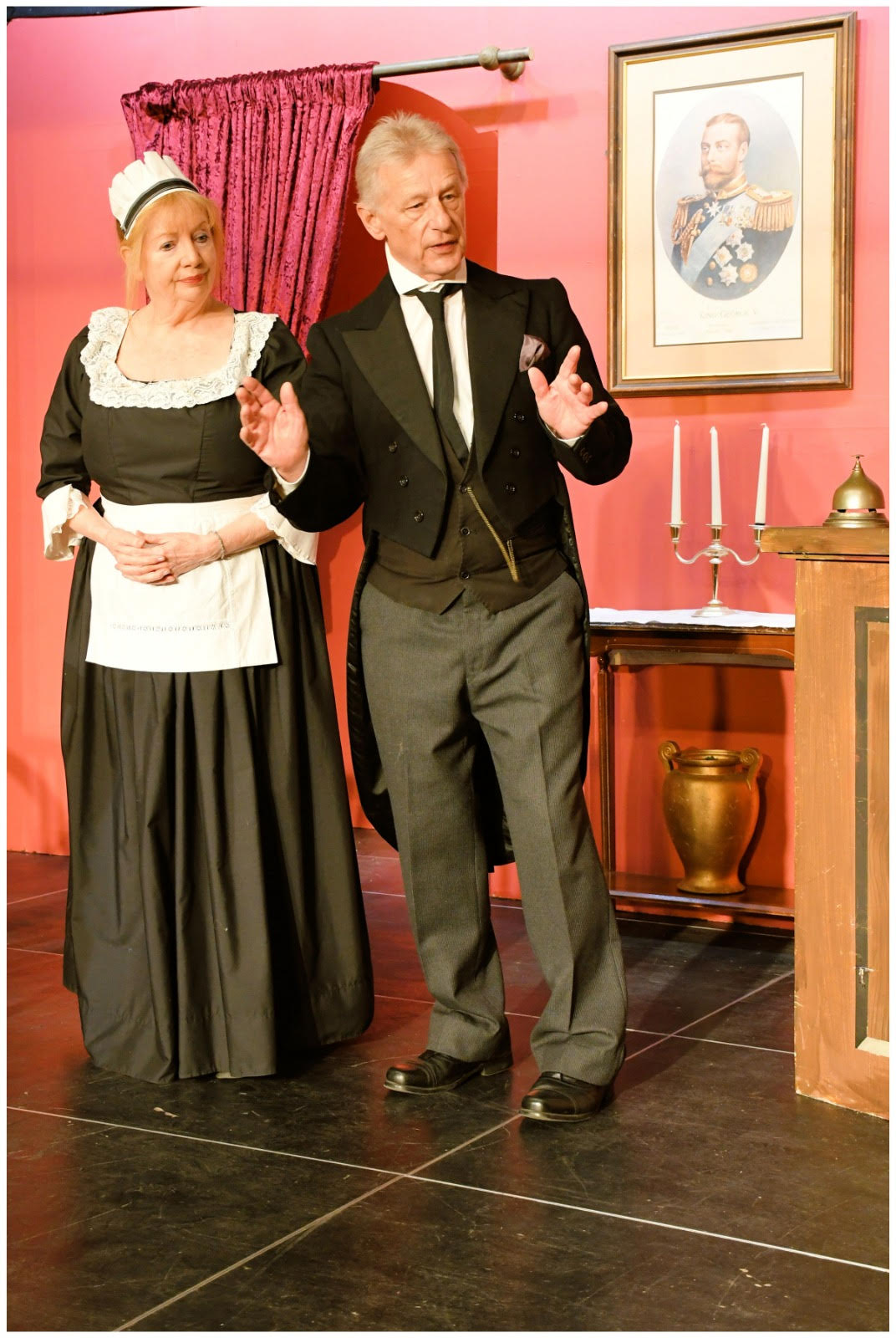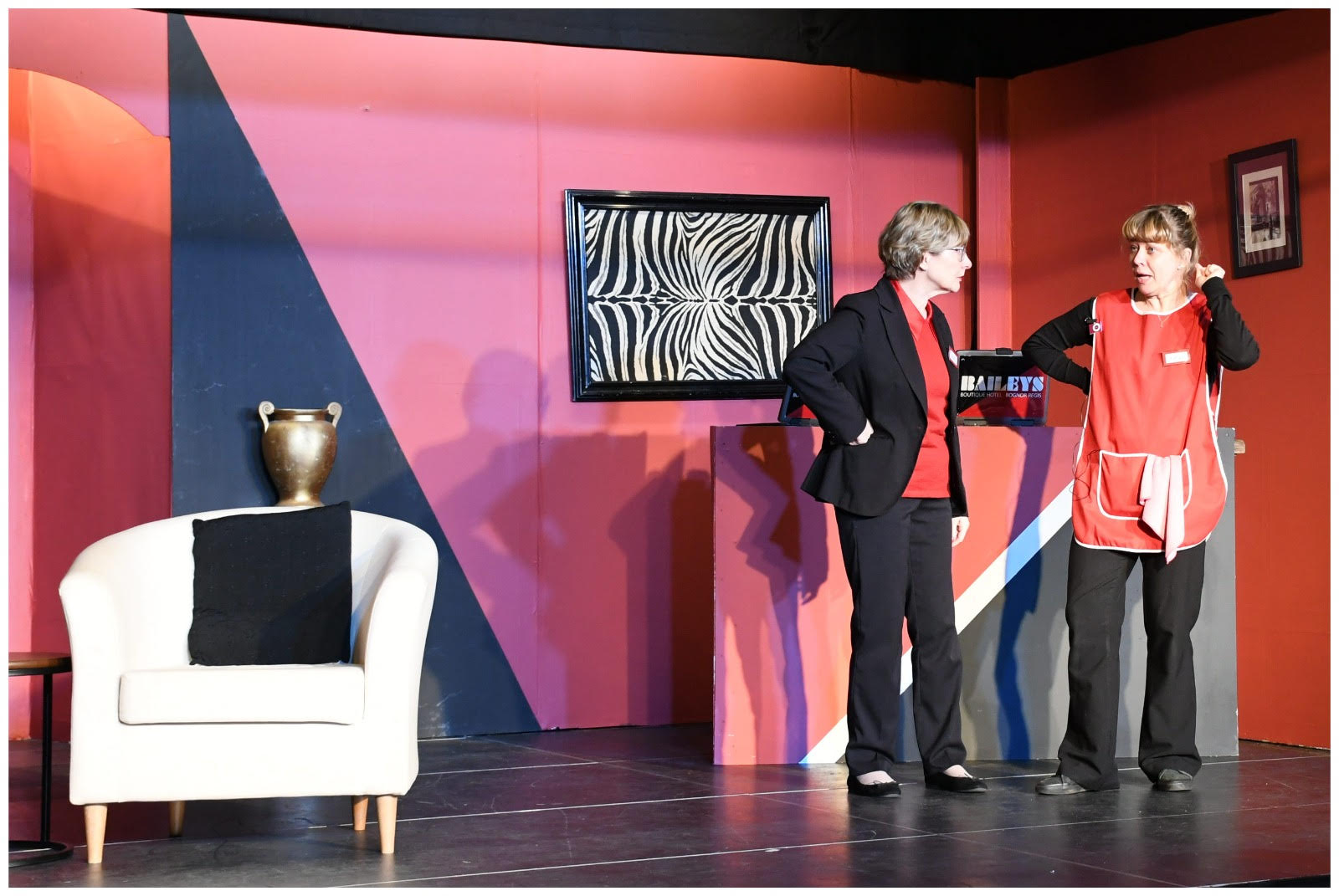 Mike Keith, as the hotel manager Mr. Swinton, did a great job in conveying the confusion of the establishment at this time in attempting to uphold traditional values and yet barely keeping the frayed edges together. Boxford Drama Group newcomers Jane Jeffries and Ellie Chamberlain, as dysfunctional mother and daughter Clarissa and Amelia Pinkerton-Smythe were the stars of the show with some fantastic characterisation and nuanced performances and long may they tread the BDG boards.
