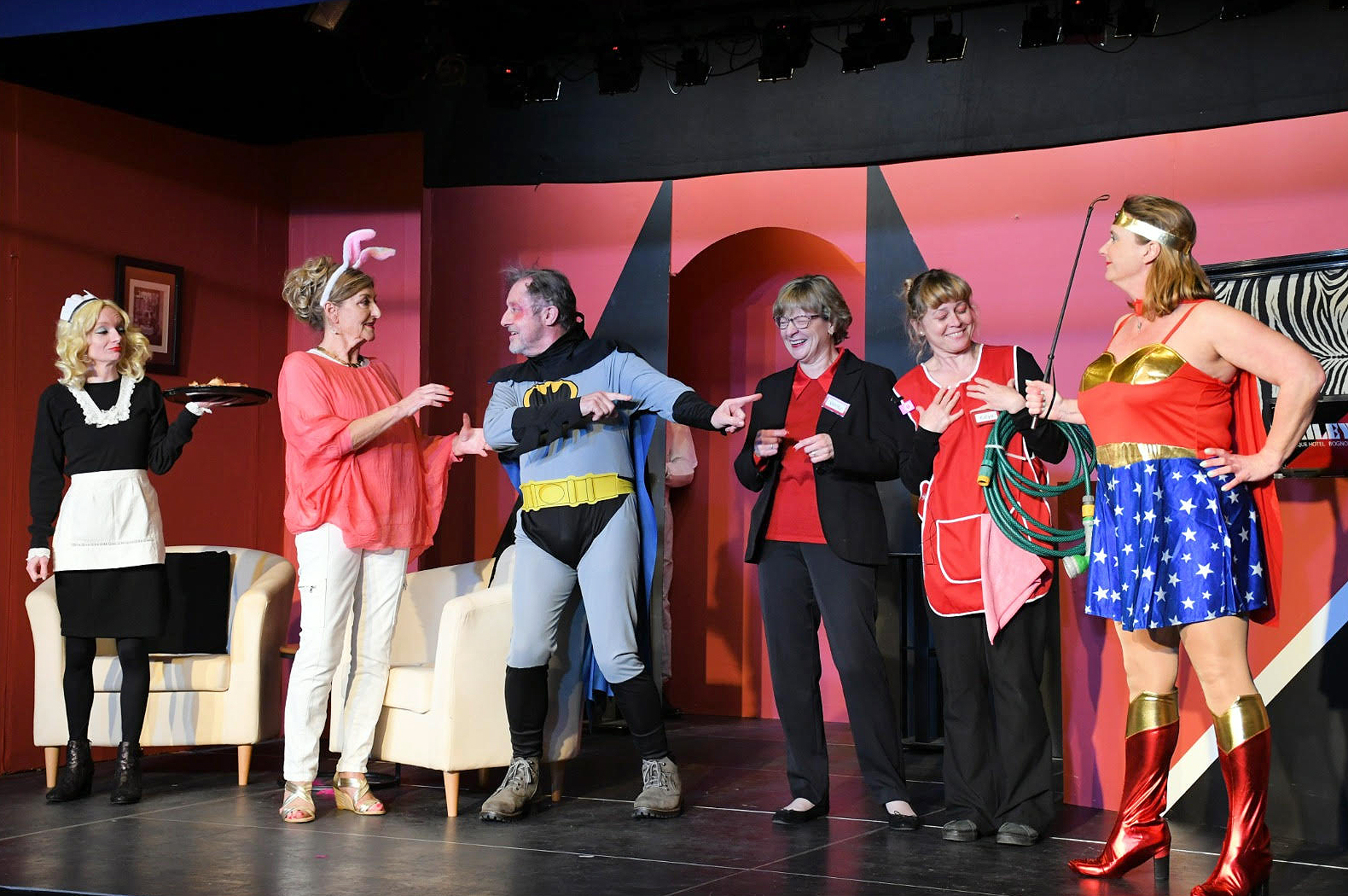 Even with these layers of subtext and social commentary running throughout, Elaine Horne’s play was genuinely funny with both acts running a sub-plot of doomed-to-be-uncovered infidelities – Frances Korabik and James Tolputt in Act 1, and Alison ‘Wonder Woman’ Barlow and Peter ‘Batman’ Korabik in Act 2 as the hapless couples.