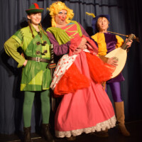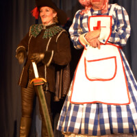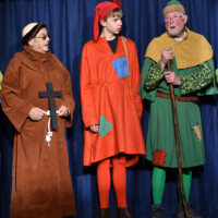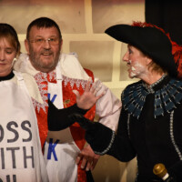 Set in Nottingham Castle and Robin’s encampment in Sherwood Forest, this was yet another in the long line of Pantomimes, written in house by a member of Boxford Drama Group. Written and Directed by David Phillips this years offering achieved the usual high standard that can be expected of a BDG production. One of the delights of traditional pantomime is that often the characters have to ad lib and react to situations not always in the script, which was the case for the opening of his year’s pantomime Robin Hood. The odd opening-night glitch, which the cast dealt with admirably, only served to add much to an already delightful rendition of the Robin Hood story. By the second night and playing to a capacity audience everything was slick and just as the producer had expected. I was there on the third night when the performers were also reacting well with audience participation, and comments. That’s what Panto is all about. Central to this story was Nanny Nora, the pantomime dame, wonderfully played once again by Joe Barrett, who has developed a real forte for this type of performance and so knows how to play every nuance and subtly to perfection, continually interacting with the audience. Nanny Nora’s mission is to help her ward, Lady Marion (Ruby Robinson), avoid the fate of marrying the evil Sheriff (Georgie Waterson) and instead win her the hand in marriage of Robin Hood (Beth Molloy). Well thats it in a nutshell. We had one new actor on the stage, Beth Molloy who gave a strong performance as a Handsome Robin and Derek Butler was encouraged to come out of retirement, to be a splendid Friar Tuck. There was also a surprise appearance at the end of the Panto by Sean Connery (or was it Nick Elliott) as King Richard who finally made Nanny Nora’s dreams come true. Everyone turned in splendid performances including the catering team who gave us our first taste of Turkey this season.